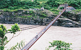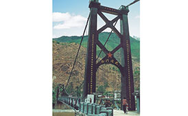 西藏墨脫解放大橋 在至今不通的西藏墨脫縣境內(nèi),公司承建了在邊防上具有總要戰(zhàn)備意義的墨脫解放大橋,2001年10月勝利建成。成都軍區(qū)授予“雪域高原架天橋,軍民一家固邊防”錦旗。