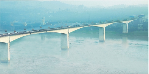 瀘州長(zhǎng)江大橋 全長(zhǎng)1252米,主跨170米,預(yù)應(yīng)力砼T型鋼構(gòu)橋,1982年9月建成通車。獲國(guó)家科技進(jìn)步三等獎(jiǎng)。