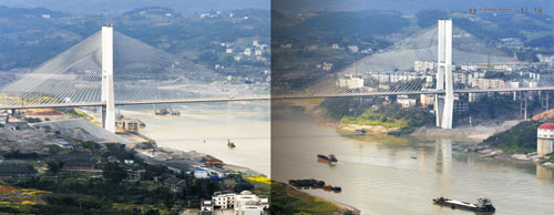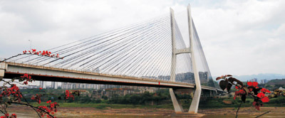 重慶涪陵長(zhǎng)江大橋 全長(zhǎng)645.11米,主橋長(zhǎng)631米,主跨330米,雙塔雙索面PC砼斜拉橋,1997年5月建成通車。獲2000年四川省天府杯金獎(jiǎng)。