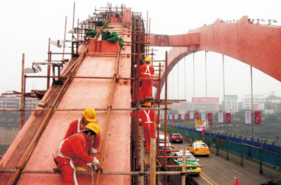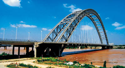全長(zhǎng)1402.15米,主跨338米,單跨下承式鋼管砼變高度桁式有推力無(wú)鉸拱橋,2004年10月建成通車(chē)。共46個(gè)吊裝節(jié)段,單節(jié)段最大吊重121.8噸,公司承擔(dān)吊裝工程。