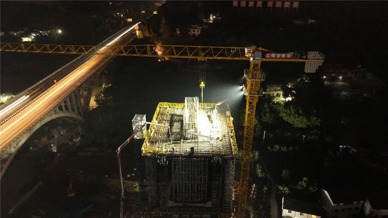 隆黃鐵路隆敘段瀘州沱江鐵路特大橋主橋?qū)侔嗡髅嫘崩瓨?酒樽造型),是國(guó)內(nèi)同類(lèi)型最大跨度的鐵路單索面斜拉橋。該橋既是項(xiàng)目部的重點(diǎn)工程,也是全線的控制性工程。10#墩、11#墩0#塊件長(zhǎng)20m,高14m,頂寬15.8m,底寬11.7m,設(shè)計(jì)混凝土方量為2400?,本次10#墩澆筑混凝土為1050?,澆筑高度為7.8-14m。此次澆筑的順利完成,標(biāo)志著沱江鐵路特大橋上部構(gòu)造施工拉開(kāi)序幕,項(xiàng)目整體施工取得階段性勝利,為沱江鐵路特大橋在2023年完成建設(shè)任務(wù)奠定了堅(jiān)實(shí)的基礎(chǔ)。