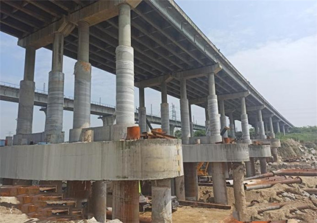 石亭江大橋于2010年建成,由于近年受下游采砂及汛期影響,加大了洪水對(duì)河床的沖刷,數(shù)次加固新增設(shè)的承臺(tái)和樁基也被沖刷外露嚴(yán)重。本次施工對(duì)石亭江大橋7-10號(hào)橋墩進(jìn)行了以下處治:原橋上部結(jié)構(gòu)保留、系梁及墩柱以下拆除,利用原始數(shù)據(jù)排架墩位設(shè)置雙柱墩,樁基采用80m長(zhǎng)、直徑2.5m鉆孔灌注摩擦樁來(lái)大大提高抗河床下切能力,原2013年增設(shè)的承臺(tái)當(dāng)此次處治樁基施工平臺(tái),墩柱處治完畢后,進(jìn)行河道疏浚利于泄洪,拆除2013年增設(shè)的7-9號(hào)墩承臺(tái)及其下出露河床面的樁基。