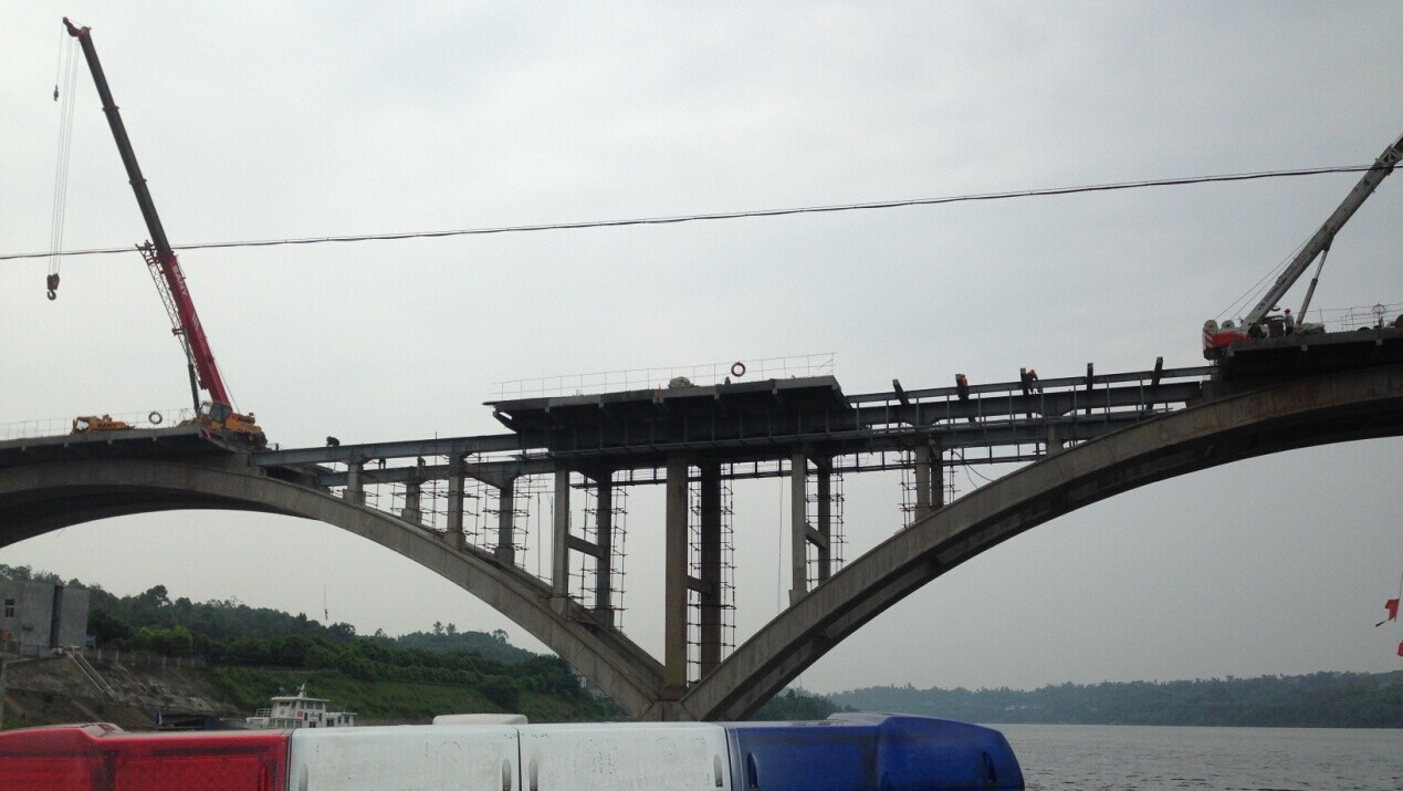 大橋為5跨不對稱拱橋且處于危險狀態(tài),施工時必須嚴格控制施工荷載,嚴格按照對稱軸(橫向以橋軸線為對稱軸,縱向以各主拱頂及各主墩為對稱軸)進行對稱、均勻卸載和加載,防止荷載集中,防止較大振動和沖擊;施工作業(yè)面受限,工序繁雜;所有施工作業(yè)均為臨空、臨邊、高空及交叉重疊的高危作業(yè),危險系數(shù)高,安全風(fēng)險大;橋下為嘉陵江三級航道,過往船只較多,在施工的同時還必須確保航道暢通。施工難度大,工期緊,社會關(guān)注度高,任務(wù)艱巨。