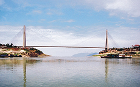 巴東長江公路大橋:建設(shè)總長2100米,橋長900.5米,主跨388米,為五跨連續(xù)雙塔雙索面預(yù)應(yīng)力砼斜拉橋。橋面寬19米(不含錨索區(qū)),設(shè)四車道及兩側(cè)各1.5米寬的人行道,北主塔高212米,時(shí)居同類型橋...