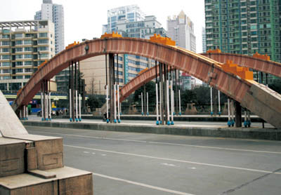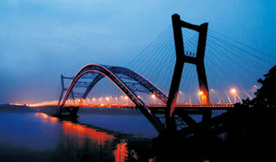 全長(zhǎng)1402.15米,主跨338米,單跨下承式鋼管砼變高度桁式有推力無(wú)鉸拱橋,2004年10月建成通車(chē)。共46個(gè)吊裝節(jié)段,單節(jié)段最大吊重121.8噸,公司承擔(dān)吊裝工程。
