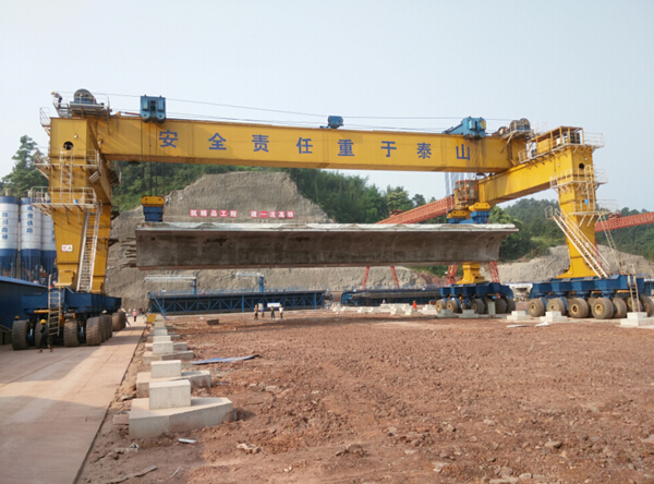 900T輪式提梁機是吊運箱梁的主要起重設(shè)備,自重550噸,額定運載能力900噸,凈跨寬度38米,起吊高度12.5米,主要用于24米至32米箱梁的脫模移梁施工。該提梁機的主體結(jié)構(gòu)由行走系統(tǒng)、起升系統(tǒng)、動力系統(tǒng)、液壓系統(tǒng)、電控系統(tǒng)、制動系統(tǒng)、操作系統(tǒng)等主要結(jié)構(gòu)組成。其外部主體結(jié)構(gòu)還包括端主梁與橫梁,主梁另有單主梁與雙梁形式;4條支腿、64個車輪。該機主結(jié)構(gòu)為門架結(jié)構(gòu),采用“人”字型支腿,可進行大幅度起升、高度調(diào)整和90°轉(zhuǎn)向跨區(qū)作業(yè),結(jié)構(gòu)先進、合理,操作可靠、安全,作業(yè)靈活。