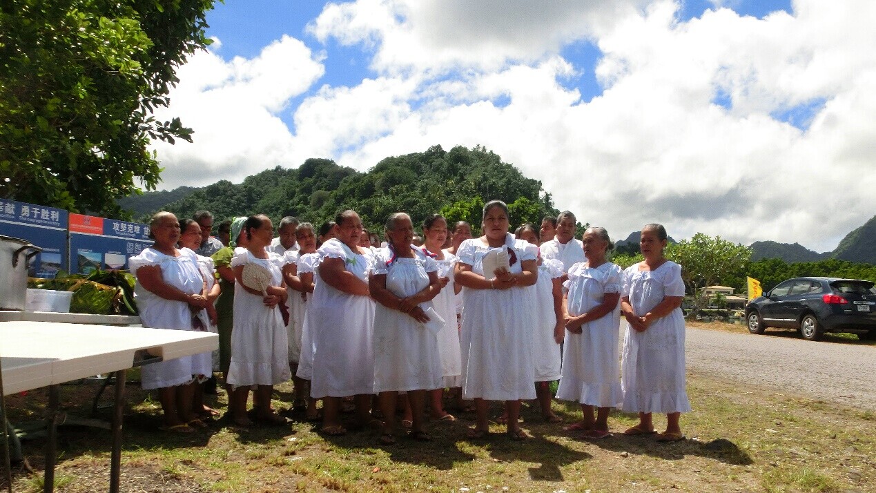 9點(diǎn)15分,會(huì)場已坐滿了觀禮嘉賓,典禮正式開始,首先進(jìn)行的是科斯雷州傳統(tǒng)的祈禱儀式??扑估捉烫玫纳窀缸呦蜓葜v席,開始宣讀祈禱詞,為援密項(xiàng)目進(jìn)行祈禱祝福,會(huì)場上全體人員同時(shí)閉目靜默,十分莊嚴(yán)神圣。緊接著在神父的帶領(lǐng)下,身穿白衣的科斯雷教堂的合唱團(tuán)成員唱起了贊歌,歌聲空靈婉轉(zhuǎn),表達(dá)了科斯雷人民對(duì)援密項(xiàng)目的祝福禮贊。